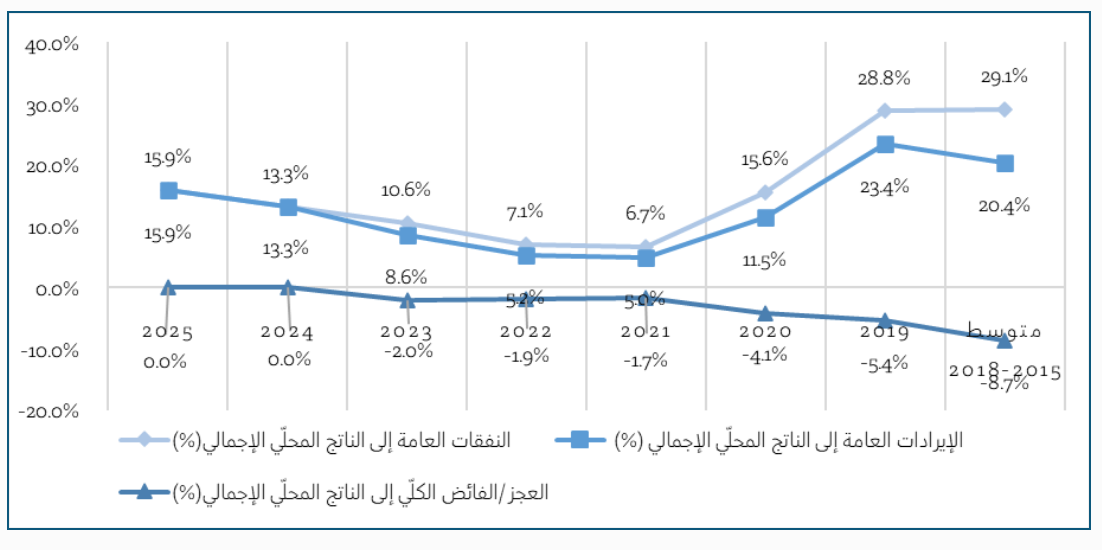 إن تحليل تطور المالية العامة كنسبة من الناتج المحلي الإجمالي (كما يوضحه الرسم البياني رقم 2 أدناه) يتجاوز مجرد رصد الأرقام ليقدم سردية اقتصادية متكاملة تكشف عن تحوّل جذري في دور الدولة، على وقع الأزمة الهيكلية ومنطق السياسات المتبعة، وتسلّط الضوء على المخاطر الكامنة في استراتيجية "العجز الصفري"، لا سيما مع الغياب التام لكلفة إعادة هيكلة الدين العام وتكاليف الحرب وإعادة الإعمار عن الحسابات الرسمية.