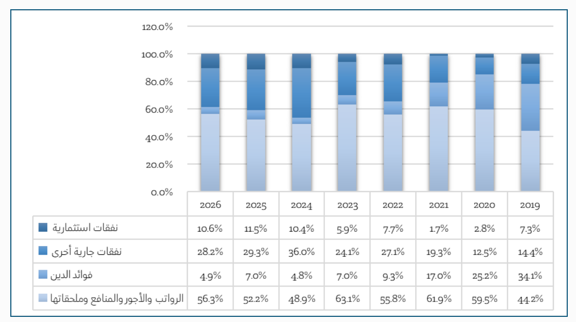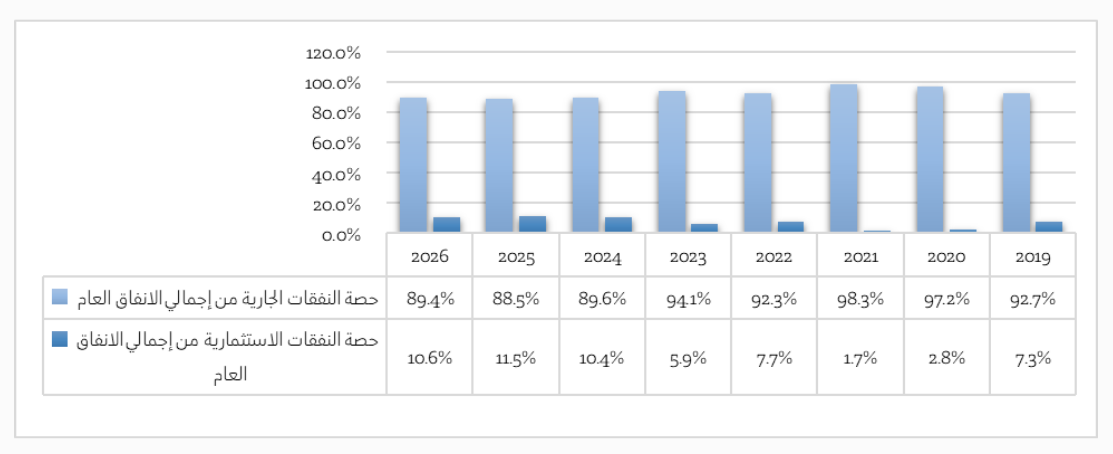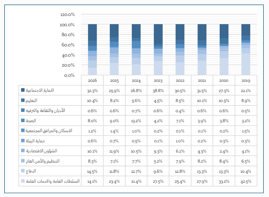 - نموًا في الشؤون الاقتصادية :يُظهر الإنفاق على الشؤون الاقتصادية مسارًا تصاعديًا واضحًا، حيث ارتفع من4.1% في عام 2019 إلى10.1% في عام 2026 (مع ذروة بلغت 11.9% في عام 2025).