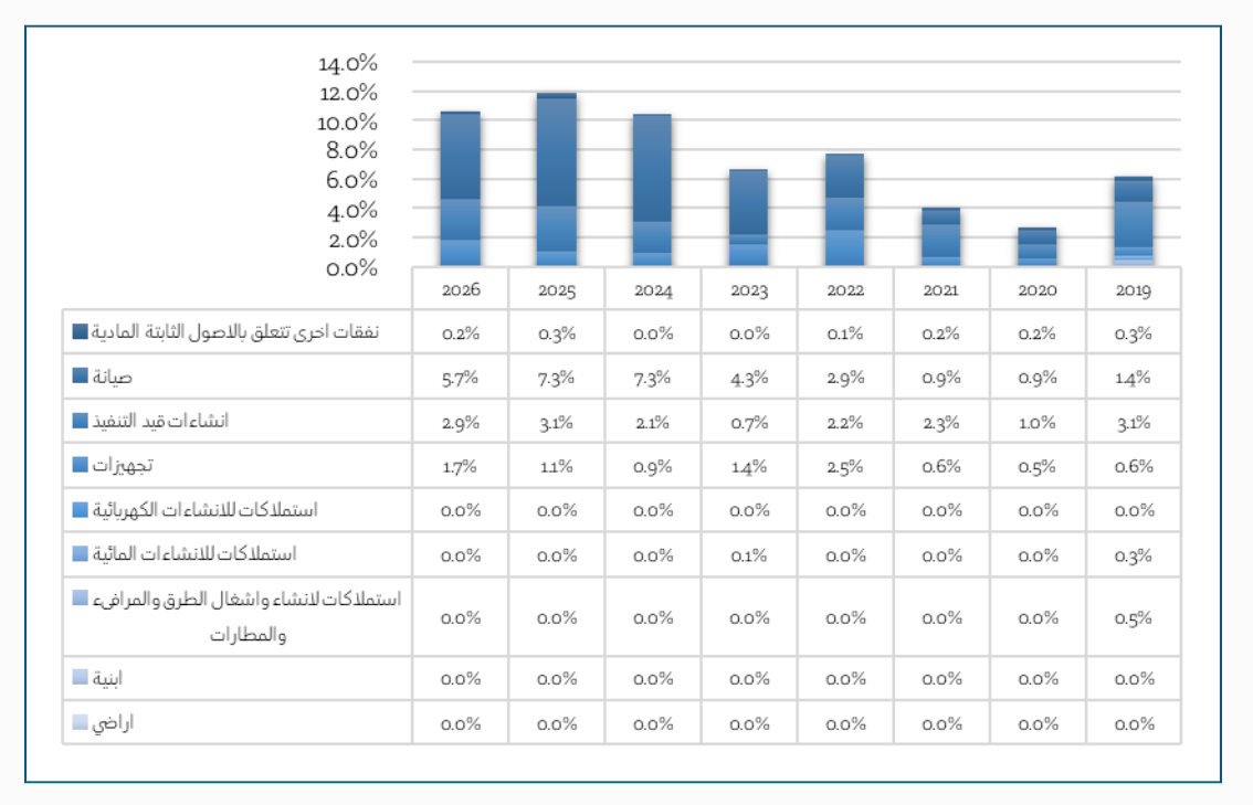 • هيمنة الصيانة واستكمال المشاريع القائمة يتركّز الجزء الأكبر من الإنفاق الاستثماري في بندي الصيانة الضرورية (تصل إلى 7.3% من إجمالي الإنفاق في 2024-2025) والإنشاءات قيد التنفيذ (تصل إلى 3.1% في 2025-2026). هذا التركيز يدل على أن الجهد الاستثماري موجه لإبقاء الأصول الحالية قيد التشغيل وإنهاء مشاريع قديمة مرتبطة بحقوق المتعهدين، بدلًا من إطلاق مبادرات جديدة.