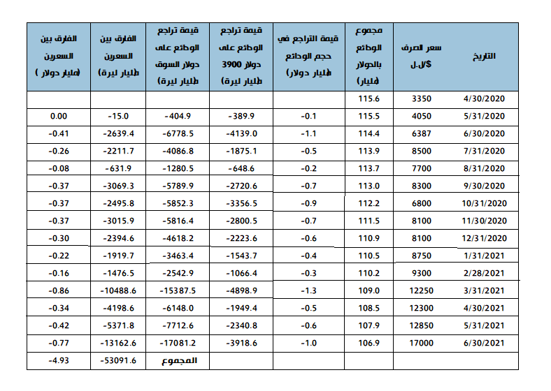 ويُعدّ مصرف لبنان شريكًا ومتضررًا في آن معًا جرّاء هذه العملية، إذ إنّه ارتضى على ما هو مُرجّح تحمّل كلفة العمليات المذكورة، والتي تعادل الفارق بين سعر الدولار المحدد بـ3900 ليرة لبنانية لعمليات السحب وسعر 1515 ل.ل المعتمد في ميزانيات المصارف والمصرف المركزي، وبذلك يقوم الأخير بخلق نقد مقداره 2400 ل.ل في مقابل كل دولار يسحبه المودعون، ويدرج ذلك ضمن ميزانيته في بند موجودات أخرى، الذي ارتفعت قيمته من 49 ألف مليار ل.ل في نيسان 2020 إلى 80 ألف مليار ليرة نهاية حزيران 2021 ثم إلى 83.7 مليار ل.ل في 31 آب 2021. ومع إضافة البند الآخر في الميزانية الذي يستخدمه مصرف لبنان لإخفاء الخسائر وهو "المقايضة على أوراق مالية وأصول ثابتة" (الذي بقي ثابتًا طوال الفترة المذكورة) يرتفع مجموع خسائر مصرف لبنان حاليًّا إلى حوالي 102 ألف مليار ليرة مقابل 68 ألف مليار ل.ل في نيسان 2020. وفي نهاية المطاف فإن خسائر مصرف لبنان هي خسائر للاقتصاد عمومًا وللدولة اللبنانية على وجه الخصوص، لأنه ملزم بتحويل 80 بالمئة من أرباحه إلى الدولة بحسب قانون النقد والتسليف. واللافت أنه في الوقت التي لاقت فيه الخطة الحكوميّة للتعافي وحلّ مشكلة الخسائر معارضة شديدة منعت تطبيقها، مضى مصرف لبنان بكل سلاسة في تنفيذ تصّوره للتعامل مع الأزمة من خلال التعميم 151 وما تلاه من تعاميم زادت الفجوة المالية التي يعاني منها البلد بدلًا من تقليصها. علمًا أن التعميم والخطة المذكورين أُقرّا في التاريخ نفسه تقريبًا (نيسان 2020).