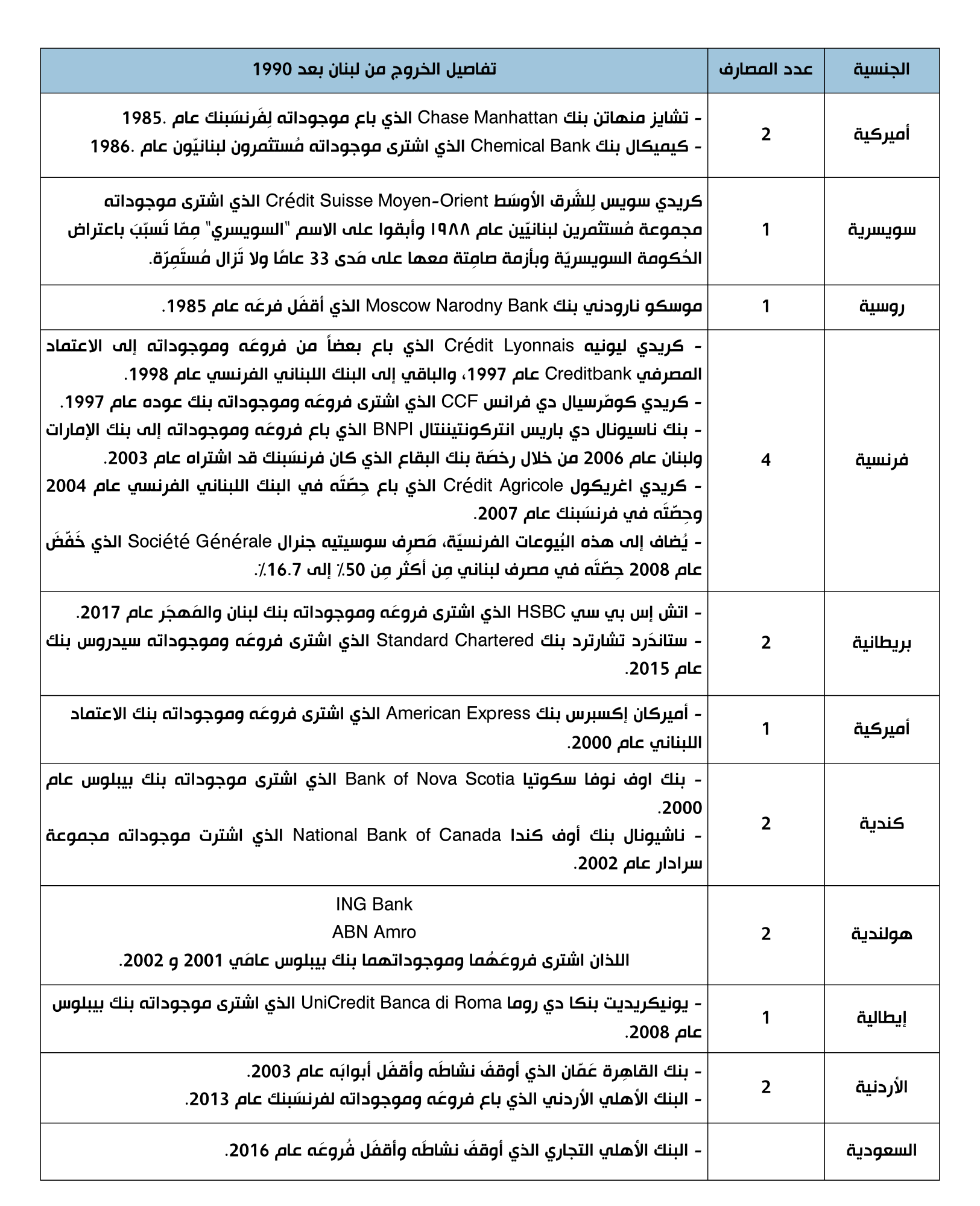 3. "تَلَبنن" القِطاع المصرفي الذي أودع معظم موجوداته بالعملات الأجنبية لدى مصرف لبنان، والذي أصبَحَت معظم موجوداته بالليرة اللبنانية دُيوناً على الدَولة. بالتالي، تفاقَمت المخاطر على القطاع المَصرفي ولَم يُحَرِّك أحَد ساكناً، فغادَرتْ المَصارِف الأجنبيّة لبنان تدريجيّاً خوفاً من هذه المخاطر في حين كان المسؤولون عن القطاع والمُشرفون عليه يطمئنون اللبنانيّين كَذباً بأنّ الوضع المصرفي بخَير (يُراجَع الجَدوَل المُرفَق).