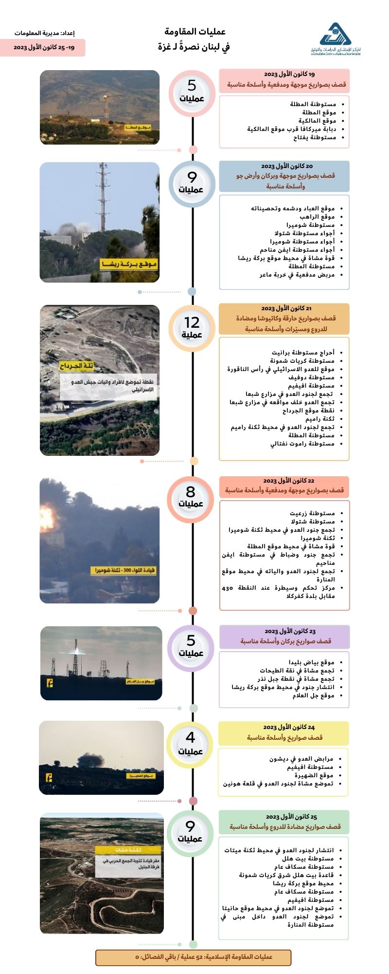 مديرية المعلومات • 2023-12-30 • في انفوغراف • تحميل الملف انفوغراف | عمليات المقاومة في لبنان نصرة لـ غزة - إعداد مديرية المعلومات - من 19 إلى 25 كانون الأول 2023 إنفوغراف يحاكي عمليات المقاومة في لبنان نصرة لـ غزة - إعداد مديرية المعلومات -من 19 إلى 25 كانون الأول 2023 تحميل الملف مديرية المعلومات المقال السابق انفوغراف | عمليات المقاومة في لبنان نصرة لـ غزة - إعداد مديرية المعلومات -من 26 إلى 31 كانون الأول 2023 المقال التالي انفوغراف | عمليات المقاومة في لبنان نصرة لـ غزة - إعداد مديرية المعلومات - من 12 إلى 18 كانون الأول 2023 مواضيع ذات صلة: استراتيجية الأمن القومي لإدارة ترامب قراءة المزيد رؤية انقرة لسوريا: بين مكافحة الإرهاب ومواجهة "إسرائيل" - بين 14 - 28 آب 2025 قراءة المزيد المقاومة خيار غالبية اللبنانيين - آب 2025 قراءة المزيد