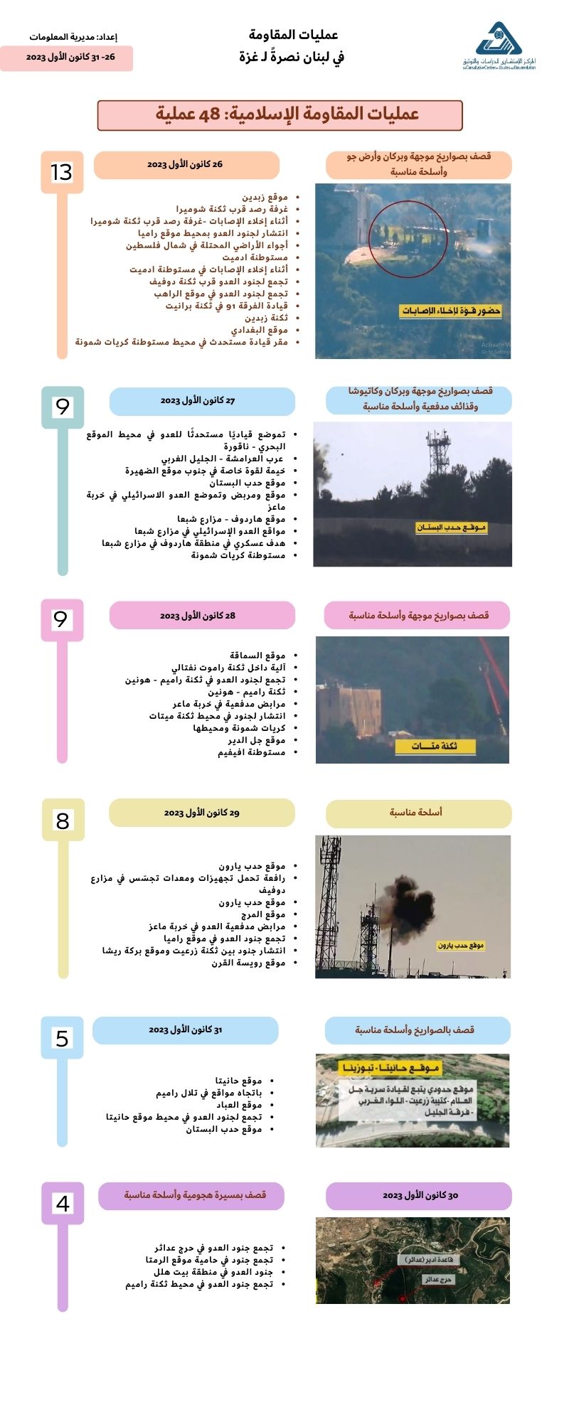 مديرية المعلومات • 2024-01-01 • في انفوغراف • تحميل الملف انفوغراف | عمليات المقاومة في لبنان نصرة لـ غزة - إعداد مديرية المعلومات -من 26 إلى 31 كانون الأول 2023 إنفوغراف يحاكي عمليات المقاومة في لبنان نصرة لـ غزة - إعداد مديرية المعلومات - من 26 إلى 31 كانون الأول 2023 تحميل الملف مديرية المعلومات المقال السابق انفوغراف | عمليات المقاومة في لبنان نصرة لـ غزة - إعداد مديرية المعلومات -من 1 إلى 7 كانون الثاني 2024 المقال التالي انفوغراف | عمليات المقاومة في لبنان نصرة لـ غزة - إعداد مديرية المعلومات - من 19 إلى 25 كانون الأول 2023 مواضيع ذات صلة: استراتيجية الأمن القومي لإدارة ترامب قراءة المزيد رؤية انقرة لسوريا: بين مكافحة الإرهاب ومواجهة "إسرائيل" - بين 14 - 28 آب 2025 قراءة المزيد المقاومة خيار غالبية اللبنانيين - آب 2025 قراءة المزيد