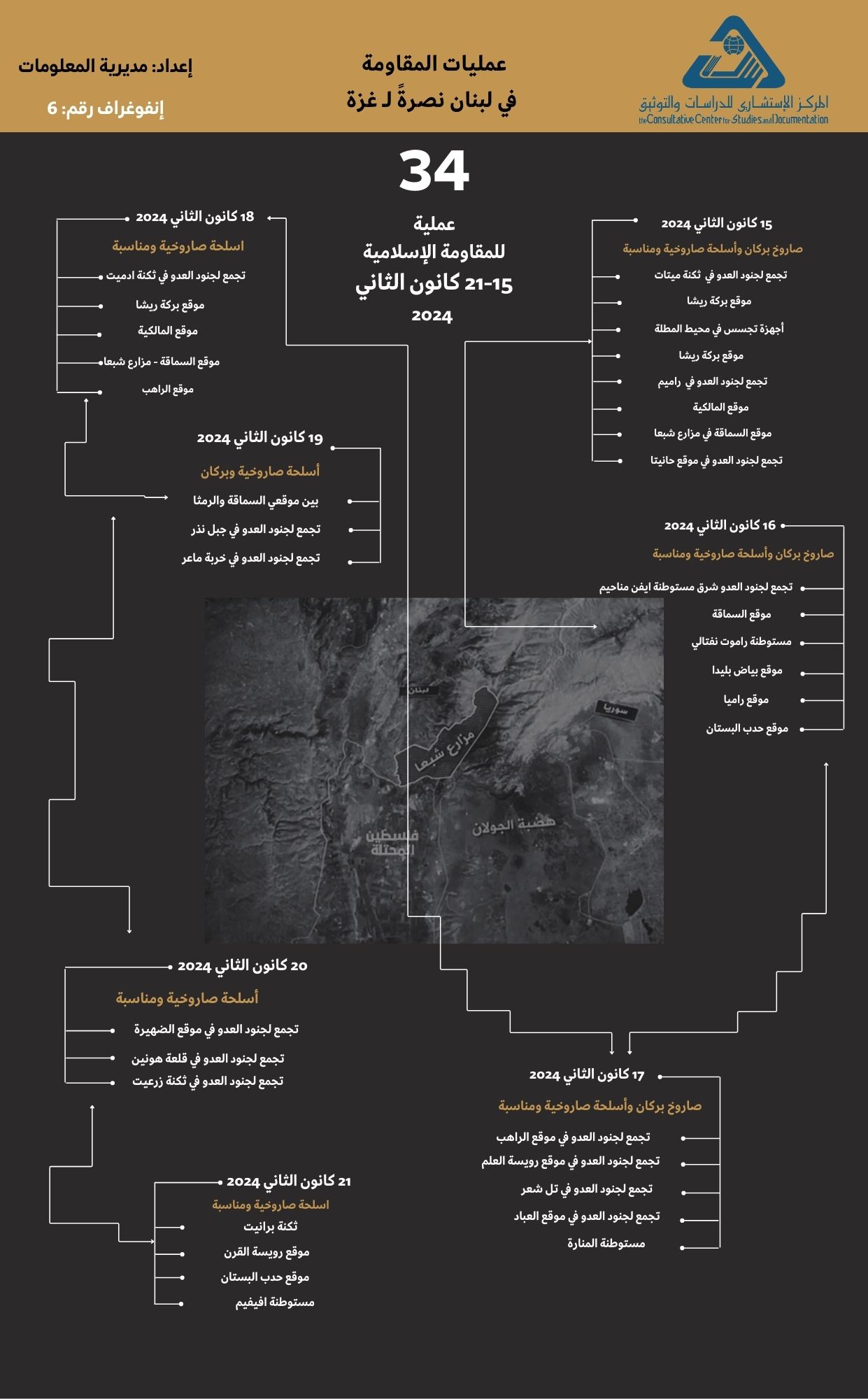 مديرية المعلومات • 2024-01-24 • في انفوغراف • تحميل الملف انفوغراف | عمليات المقاومة في لبنان نصرة لـ غزة - إعداد مديرية المعلومات - رقم 6 - من 15 إلى 21 كانون الثاني 2024 إنفوغراف يحاكي عمليات المقاومة في لبنان نصرة لـ غزة - إعداد مديرية المعلومات - من 15 إلى 21 كانون الثاني 2024 تحميل الملف مديرية المعلومات المقال السابق نشرة المصادر الإلكترونية | إعداد مديرية المعلومات - العدد الثاني والأربعون/ كانون الأول 2023 المقال التالي انفوغراف | عمليات المقاومة في لبنان نصرة لـ غزة - إعداد مديرية المعلومات - من 8 إلى 14 كانون الثاني 2024 مواضيع ذات صلة: استراتيجية الأمن القومي لإدارة ترامب قراءة المزيد رؤية انقرة لسوريا: بين مكافحة الإرهاب ومواجهة "إسرائيل" - بين 14 - 28 آب 2025 قراءة المزيد المقاومة خيار غالبية اللبنانيين - آب 2025 قراءة المزيد