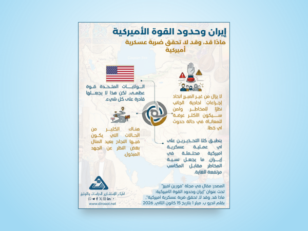 "إيران وحدود القوة الأميركية: ماذا قد، وقد لا، تحقق ضربة عسكرية أميركية" انفوغراف | مديرية الدراسات الاستراتيجية / 2026-01-27 المزيد..